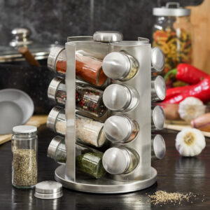 Obrotowy stojak na przyprawy ze stali nierdzewnej. W zestawie 16 szklanych słoiczków z sitkami. Elegancki design, łatwy dostęp. Marka Kinghoff.