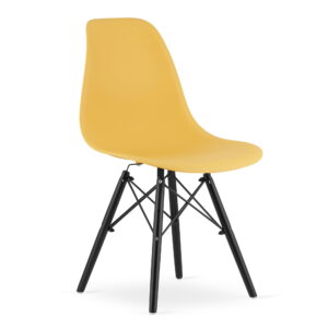 Zestaw 4 krzeseł w stylu skandynawskim. Kolor musztardowy, nogi bukowe naturalne. Siedzisko z tworzywa łatwe w czyszczeniu. Idealne do kuchni.