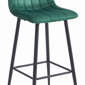 Zestaw 2 wysokich hokerów w kolorze butelkowej zieleni. Welur i czarny metal. Wysokość siedziska 76 cm (do barku). Udźwig 110 kg.