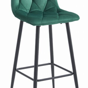 Zestaw 2 wysokich hokerów w kolorze butelkowej zieleni. Welur i czarny metal. Wysokość siedziska 76 cm (do barku). Udźwig 110 kg.