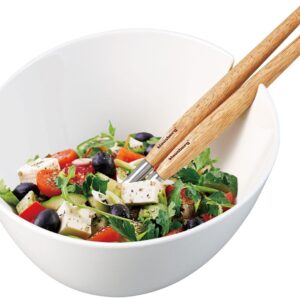 Biała miska porcelanowa do sałatek z łyżkami w zestawie. Średnica 23,5 cm. Sztućce z rączkami z drewna akacjowego. Wycięcia na łyżki. Marka Klausberg.