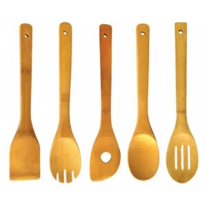 Zestaw 5 drewnianych przyborów kuchennych w stojaku. Łyżki, łopatka, widelec. Bezpieczne dla teflonu.