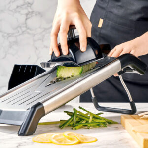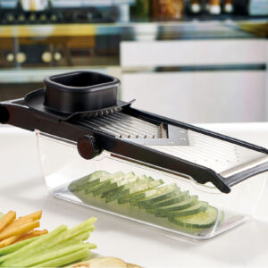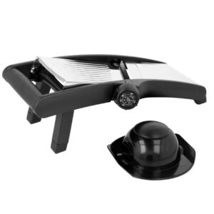 Profesjonalna szatkownica mandolina Brunbeste z 5 opcjami krojenia. Regulowana grubość, ostrza ze stali nierdzewnej, uchwyt bezpieczeństwa. Kolor czarny.