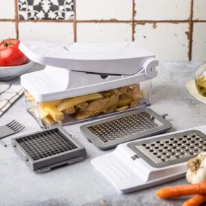 Wielofunkcyjna krajalnica do warzyw z pojemnikiem. 5 ostrzy: kostka, plastry, frytki. Bezpieczna i szybka. Marka Kinghoff.