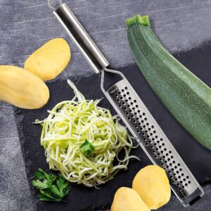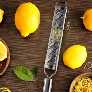 Długa, płaska tarka ręczna (38 cm). Do parmezanu, cytrusów, czekolady. Antypoślizgowa końcówka. Stal nierdzewna. Marka Orion.