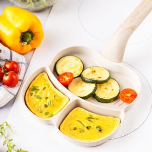 Patelnia dzielona 3w1 z gładką sekcją. Dwa miejsca na jajka + płaska część do smażenia. Powłoka marmurowa. Marka Klausberg.