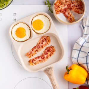 54,99 złBeżowa patelnia dzielona 3w1 do śniadań. Sekcja na jajka i grill. Powłoka marmurowa, uchwyt drewnopodobny. Na indukcję. Marka Klausberg.