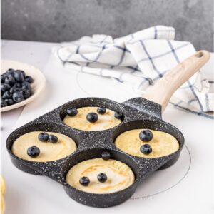 Czarna patelnia do jajek i placków z 4 otworami. Powłoka marmurowa non-stick. Do smażenia bez tłuszczu. Na indukcję. Marka Klausberg.