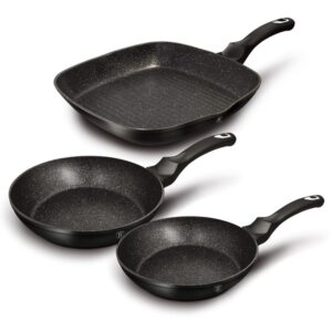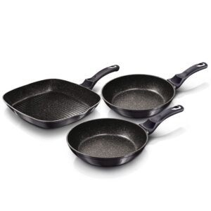 Zestaw 3 patelni (w tym grillowa) w kolorze czarno-srebrnym. Powłoka granitowa. Turbo Indukcja.