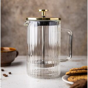 Elegancki zaparzacz 1000ml z podwójnymi ściankami. Złote dodatki, bezpieczne użytkowanie i łatwe mycie w zmywarce.
