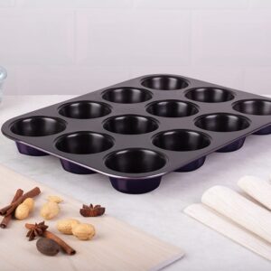 Fioletowa forma na 12 muffinek z powłoką tytanową. Seria Purple Eclipse. Nieprzywierająca, trwała, łatwa w czyszczeniu. Marka Berlinger Haus.