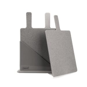 Zestaw 3 szarych desek do krojenia na stojaku. Tworzywo sztuczne, bezpieczne dla noży, do zmywarki.