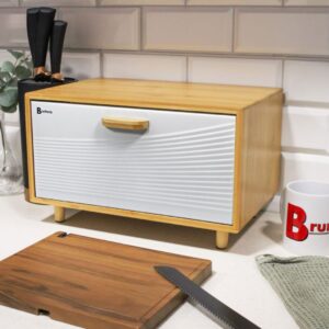 Biały chlebak bambusowy ze stalową pokrywą. Skandynawski design, trwałe materiały, wymiary 35,5x20x21,5 cm. Chroni świeżość pieczywa. Produkt marki Brunbeste.