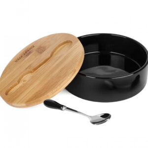 Okrągła cukierniczka ceramiczna 250 ml z bambusową pokrywką. W zestawie ceramiczna łyżeczka. Styl skandynawski, wysoka jakość wykonania. Marka Vilde.