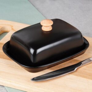 Czarna maselniczka ceramiczna z drewnianym uchwytem. Elegancki pojemnik na masło, chroni świeżość, wymiary 16×12,5 cm. Idealna do nowoczesnej kuchni.