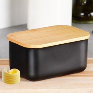 Czarna maselniczka stalowa z bambusową pokrywką. Styl loft/industrialny. Wymiary 15x10x7,5 cm. Elegancka i trwała. Marka Vilde.