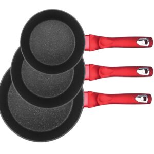 Zestaw 3 patelni (20/24/28 cm) w kolorze bordowym. Powłoka granitowa, dno indukcyjne, ergonomiczne uchwyty.
