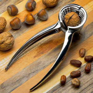 Solidny stalowy dziadek do orzechów. Dwa otwory kruszące, ergonomiczne rączki. Idealny do orzechów włoskich i laskowych. Długość 17 cm. Marka Kinghoff.