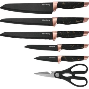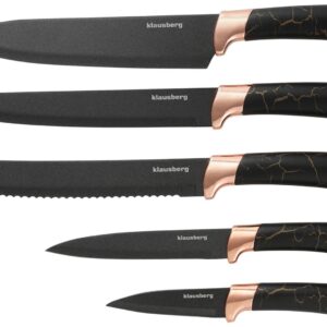 Zestaw 5 noży w bloku. Czarny marmurek z różowym złotem. Ostrza non-stick.
