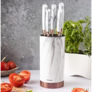 Zestaw 5 noży w bloku. Białe ostrza, wzór marmurka, różowe złoto. Powłoka non-stick.