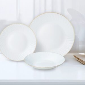 Zastawa 18 elementów dla 6 osób ze złotym rantem. Elegancka biała ceramika. Nie do mikrofali, zalecane mycie ręczne.