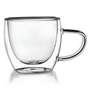 Szklanka termiczna z podwójną ścianką do espresso (110 ml). Utrzymuje ciepło, nie parzy w dłonie. Z uchem. Marka Orion.