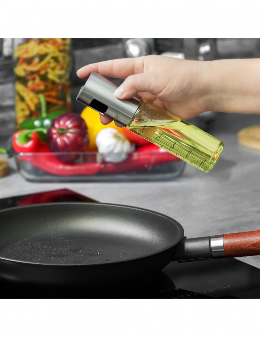 Zredukuj kalorie i zadbaj o zdrowie swojej rodziny! Spryskiwacz do oleju o pojemności 100ml od Kinghoff pozwala na precyzyjne i równomierne rozpylenie oliwy, octu lub soku z cytryny bezpośrednio na potrawę lub patelnię. Wykonany z najwyższej jakości stali nierdzewnej i szkła, jest wolny od BPA i przyjazny dla środowiska. Elegancki design sprawia, że atomizer będzie ozdobą każdej nowoczesnej kuchni.