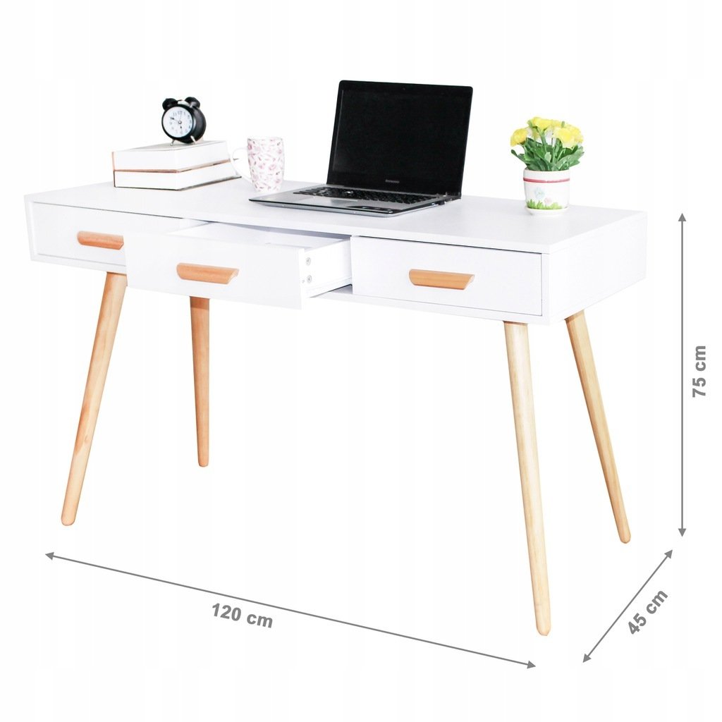 Wielofunkcyjne biurko i toaletka w jednym. Posiada 3 pojemne szuflady, nogi z litego drewna sosnowego i odporny na zarysowania blat. Idealne do sypialni, biura lub salonu w stylu skandynawskim.