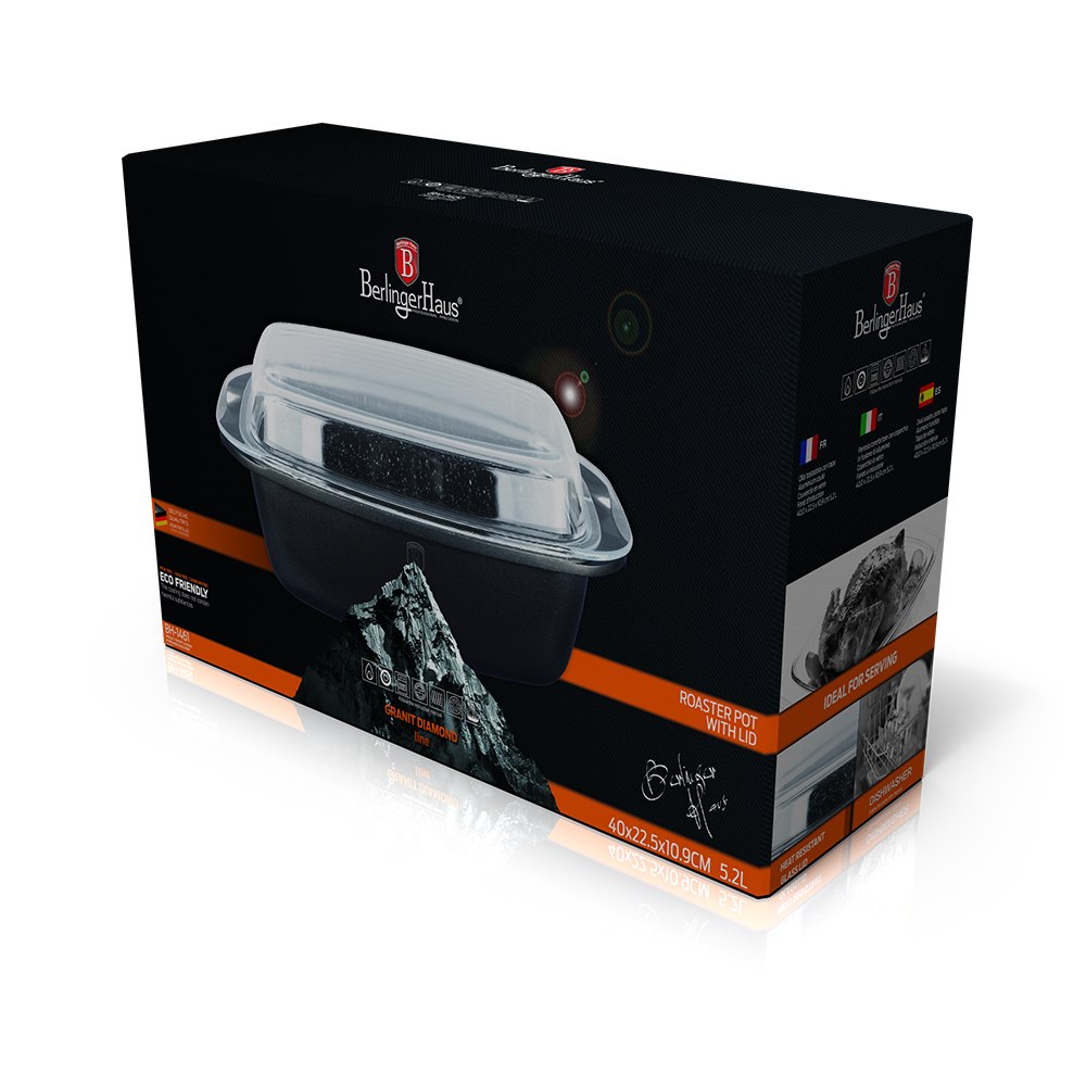 Brytfanna granitowa 5,2L z pokrywą żaroodporną. 3-warstwowa powłoka non-stick, Turbo Indukcja, wolna od PFOA. Odporna na temperatury do 220°C. Profesjonalna seria Granit Diamond od Berlinger Haus.
