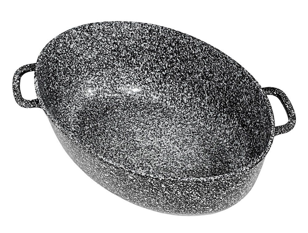 - Przechowywanie: Aby uniknąć zarysowań, nie kładź metalowej patelni bezpośrednio na powłokę marmurową brytfanny bez materiałowej przekładki.