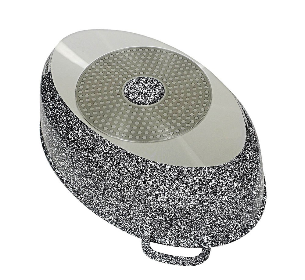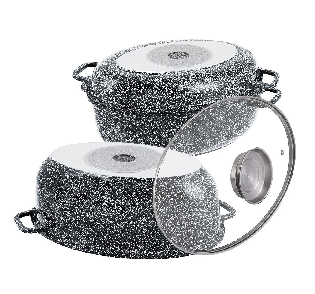 Zestaw 3-częściowy: brytfanna 8L, patelnia grillowa i pokrywa Aroma Knob. Powłoka marmurowa, dno indukcyjne, odlew aluminium. Odporna na ścieranie i wysokie temperatury. Marka Klausberg.