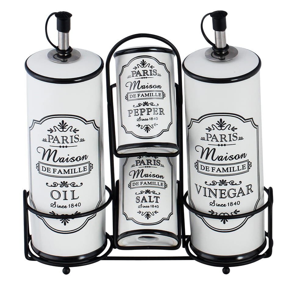 5-elementowy zestaw ceramiczny do przypraw na stojaku. Zawiera butelki na olej i ocet, solniczkę, pieprzniczkę oraz metalowy stojak. Elegancki design z napisami. Marka Maestro.