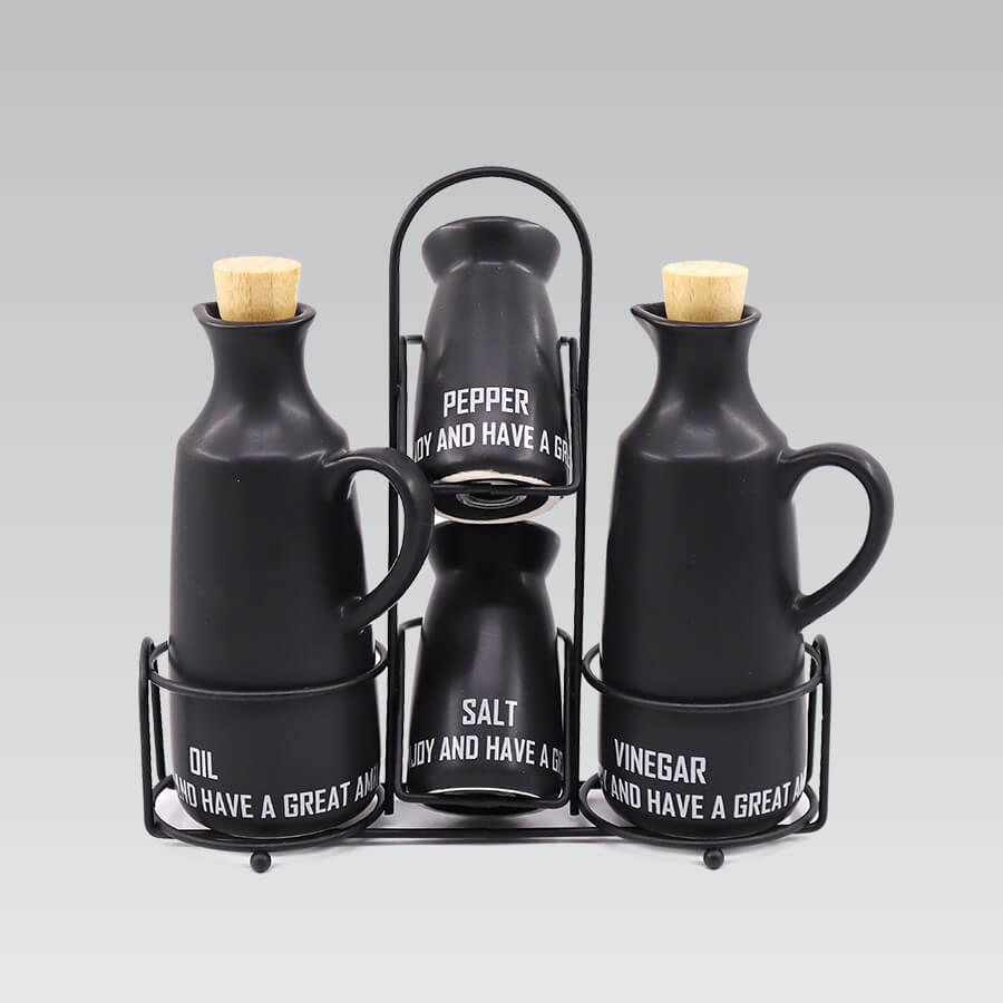 Ekologiczny zestaw do przypraw 5 el. Maestro Eco Style. Butelki 300ml, przyprawniki 100ml i metalowy stojak. Trwała ceramika, nowoczesny design. Idealny do każdej kuchni.
