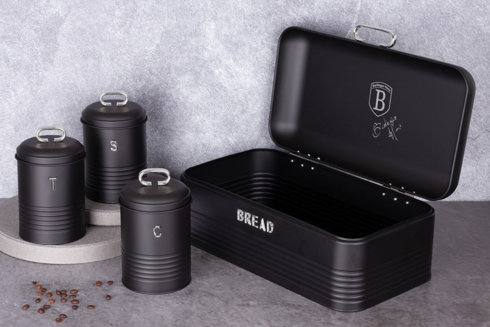 Luksusowy zestaw: chlebak + 3 pojemniki kuchenne. Seria Black Silver (czarny mat/srebro). Stal nierdzewna, nowoczesny design. Idealny na chleb, kawę, herbatę i cukier. Berlinger Haus.