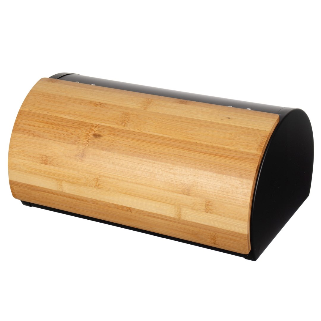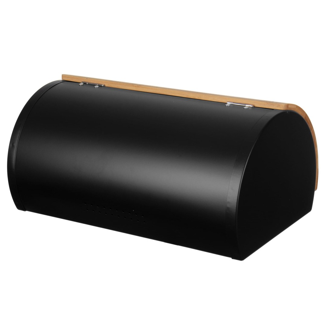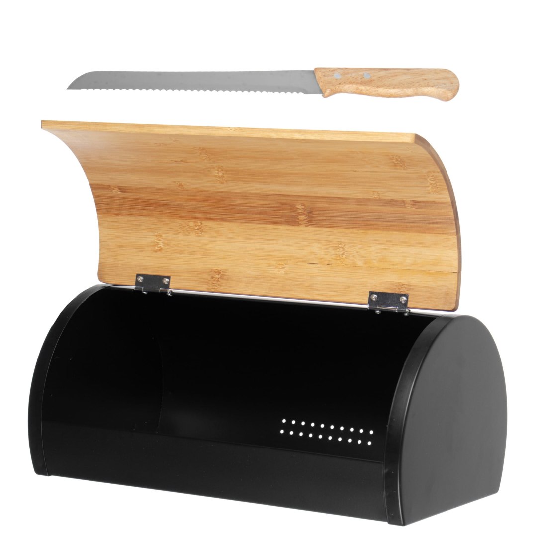 Zestaw: Czarny chlebak stalowy, drewniana pokrywa i nóż do chleba. Wymiary 35×22,5×16,5 cm. Styl nowoczesny, kompletne rozwiązanie do kuchni. Marka Brunbeste.