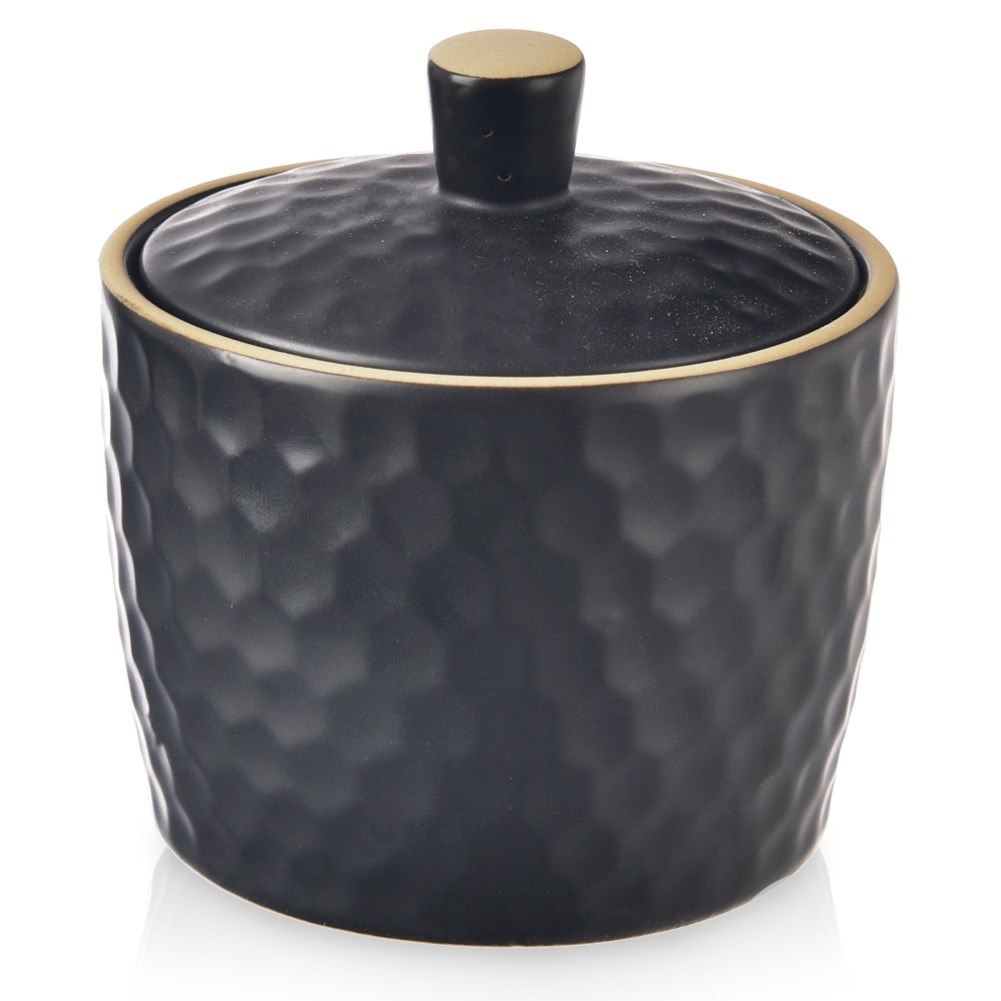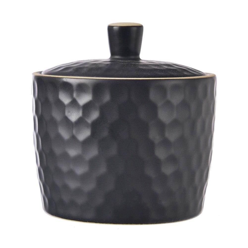 Czarna cukierniczka ceramiczna z pokrywką 320 ml. Dekoracyjna faktura plastra miodu, wykonana z trwałej kamionki. Można myć w zmywarce. Seria Tea Time od Orion.