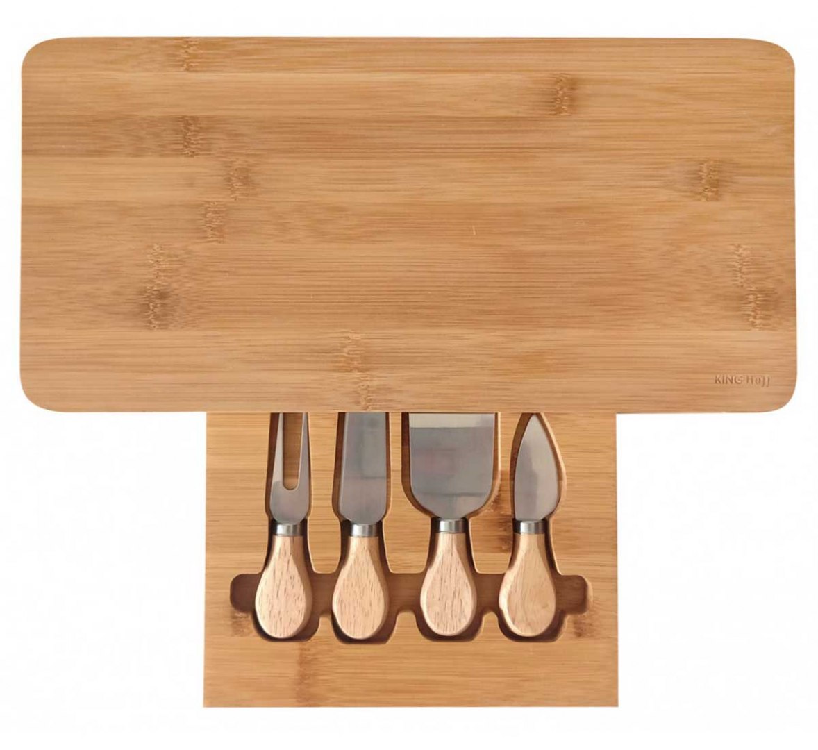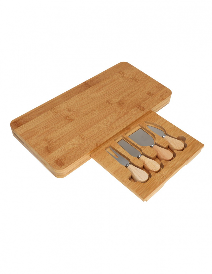 Bambusowa deska do serów z ukrytą szufladką i 4 nożami. Idealna do serwowania serów, wędlin i przekąsek. Elegancki zestaw prezentowy 5-elementowy. Marka Kinghoff.