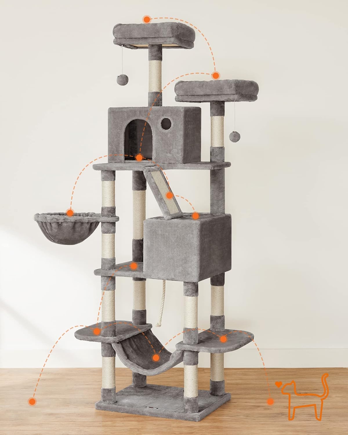 Solidna podstawa i możliwość przymocowania do ściany (zalecane przy tej wysokości) gwarantują stabilność nawet podczas szalonych zabaw. Liczne słupki sizalowe, platformy i budka to gwarancja, że Twój pupil nigdy nie będzie się nudził.