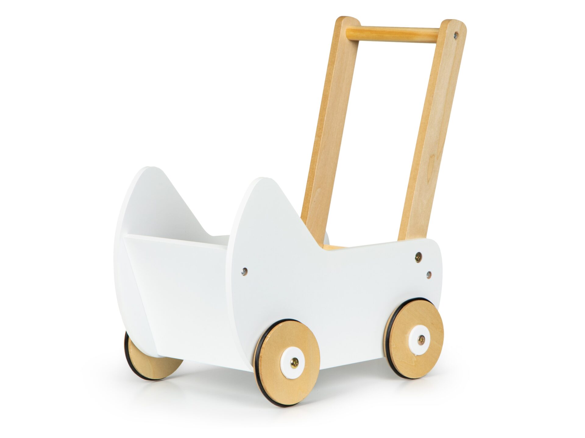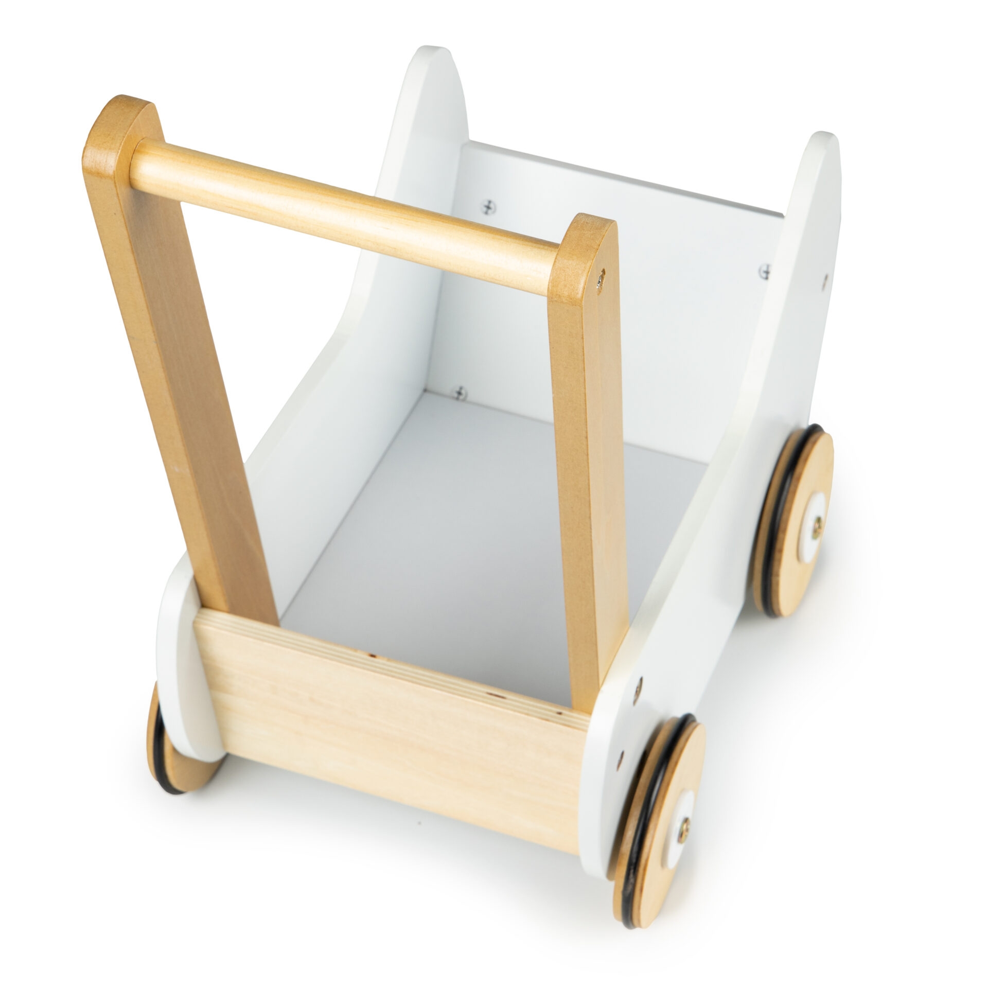 Drewniany wózek dla lalek i pchacz do nauki chodzenia. Solidna konstrukcja z bezpiecznego drewna, kółka z gumową opaską (nie rysują podłóg). Idealny dla dzieci 3+ jako wsparcie i zabawa.