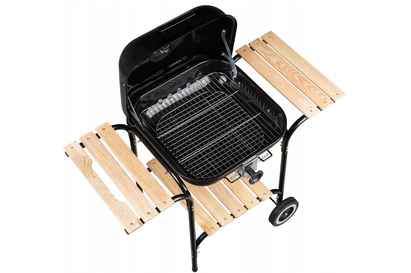- Pojemny ruszt chromowany: Wymiar 41×40 cm zapewnia mnóstwo miejsca, a pokrywa na zawiasach chroni przed dymem i wiatrem.