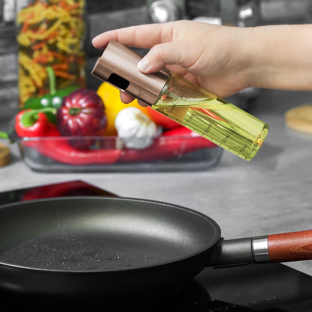 Szklany spryskiwacz do oleju 100ml z nakrętką Rose Gold. Precyzyjny atomizer, zdrowe gotowanie z mniejszą ilością tłuszczu. Idealny do oliwy i octu. Styl i funkcjonalność Kinghoff.
