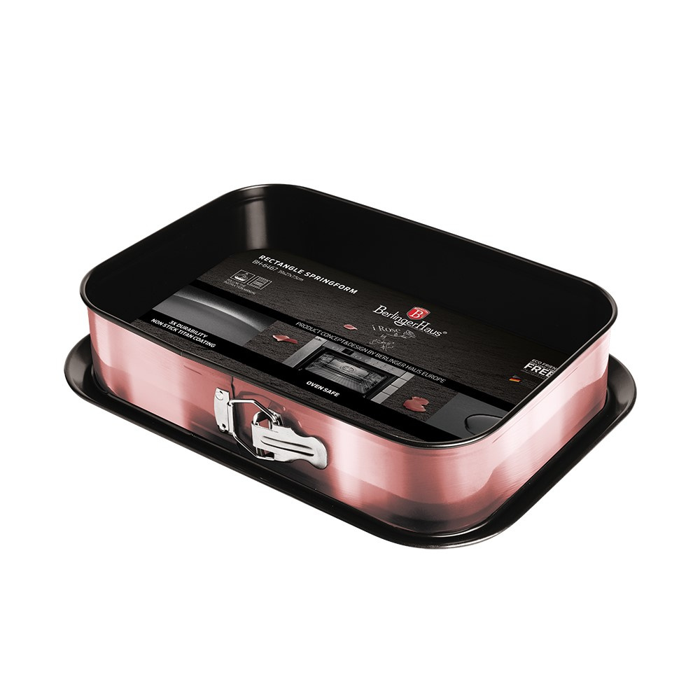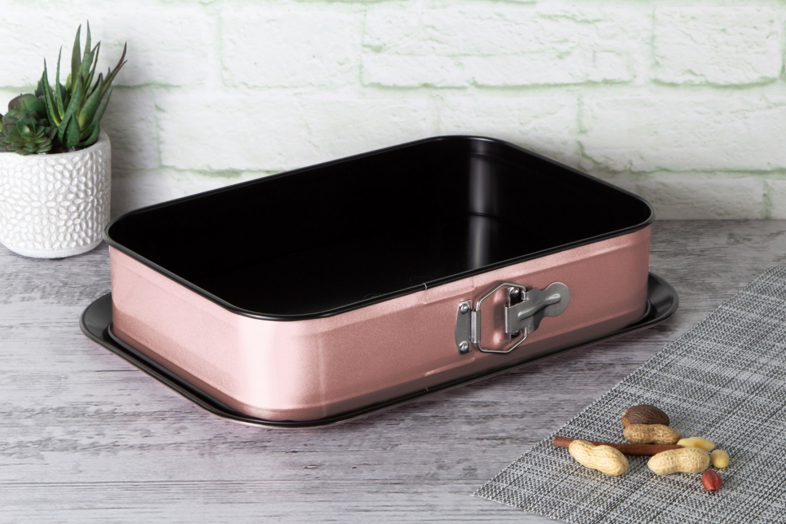 Połącz luksusowy design z profesjonalną technologią. Prostokątna forma do pieczenia Berlinger Haus BH-6467 z serii I-Rose to produkt dla wymagających. Wykonana ze stali węglowej, pokryta została potrójną warstwą powłoki tytanowej, która jest twardsza i trwalsza niż tradycyjne powłoki teflonowe czy ceramiczne. Kolor pudrowego różu z metalicznym połyskiem sprawia, że forma prezentuje się zjawiskowo.