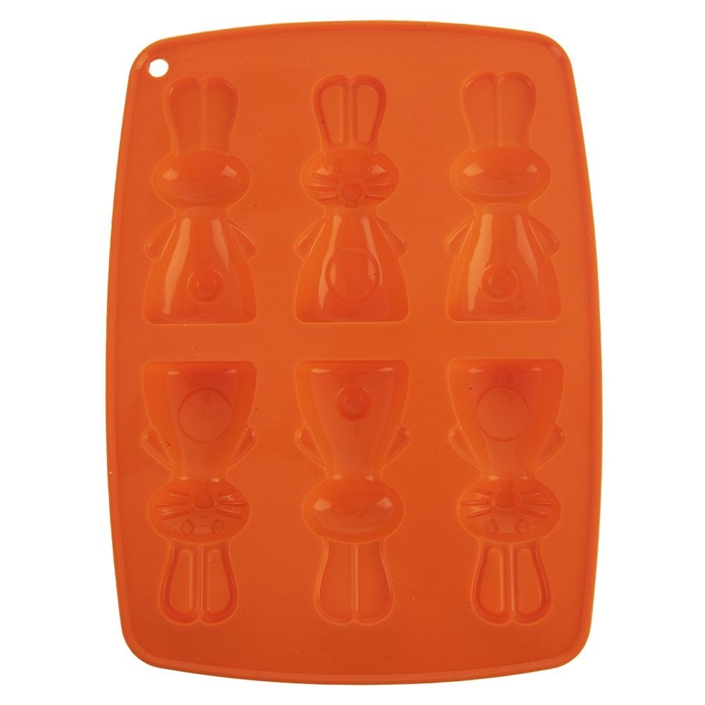 Pomarańczowa forma silikonowa na 6 zajączków. Elastyczna, nieprzywierająca. Do pieczenia i mrożenia. Idealna na wielkanocne słodycze. Marka Orion.