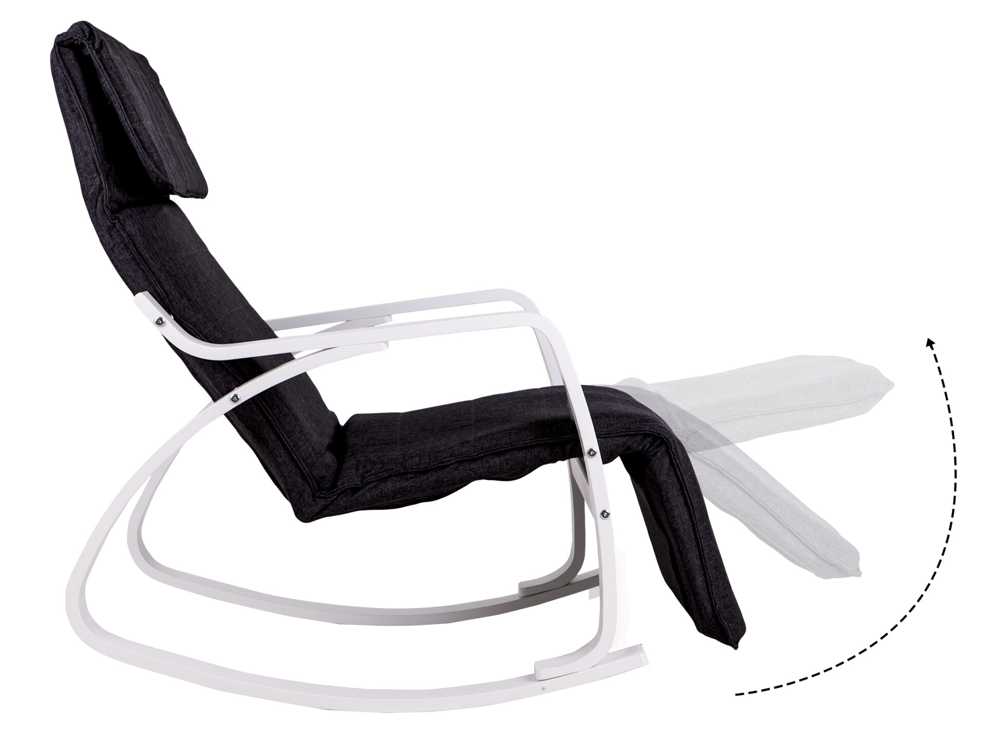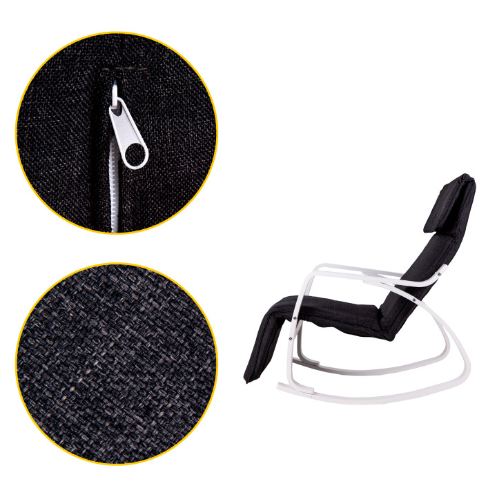 Luksusowy fotel bujany z regulowanym podnóżkiem. Nowoczesna biało-czarna stylistyka, stelaż ze sklejki brzozowej i zdejmowany bawełniany pokrowiec. Udźwig do 120 kg. Idealny relaks dla kręgosłupa.
