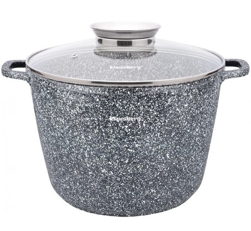 Gotuj dla całej rodziny lub na przyjęcia z garnkiem Klausberg o pojemności 10 litrów. Wykonany z odlewanego aluminium, pokryty jest twardą powłoką marmurowo-ceramiczną, która zapobiega przywieraniu potraw. Unikalną cechą tego modelu jest szklana pokrywa z uchwytem Aroma Knob – to wbudowany dozownik, który pozwala dolewać olej, wino lub wodę do potrawy bez podnoszenia pokrywki, zachowując cały aromat wewnątrz.