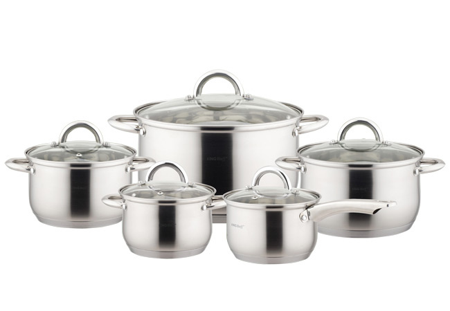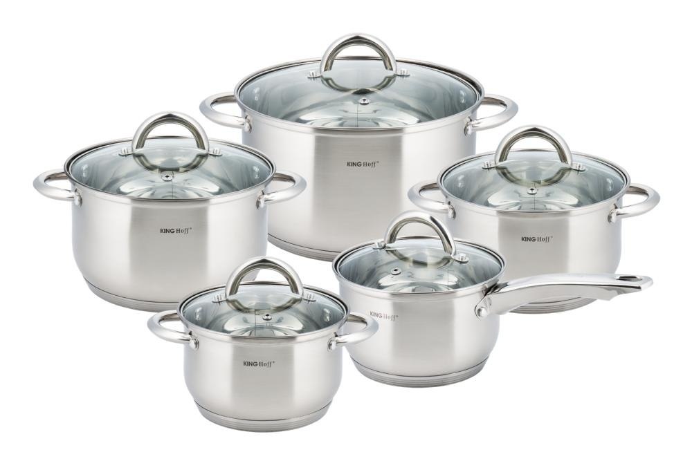 Zestaw 10 garnków ze stali nierdzewnej z miarką. Dno 5-warstwowe, na indukcję. Zawiera rondel i 4 garnki z pokrywkami. Solidny wybór na lata. Marka Kinghoff.