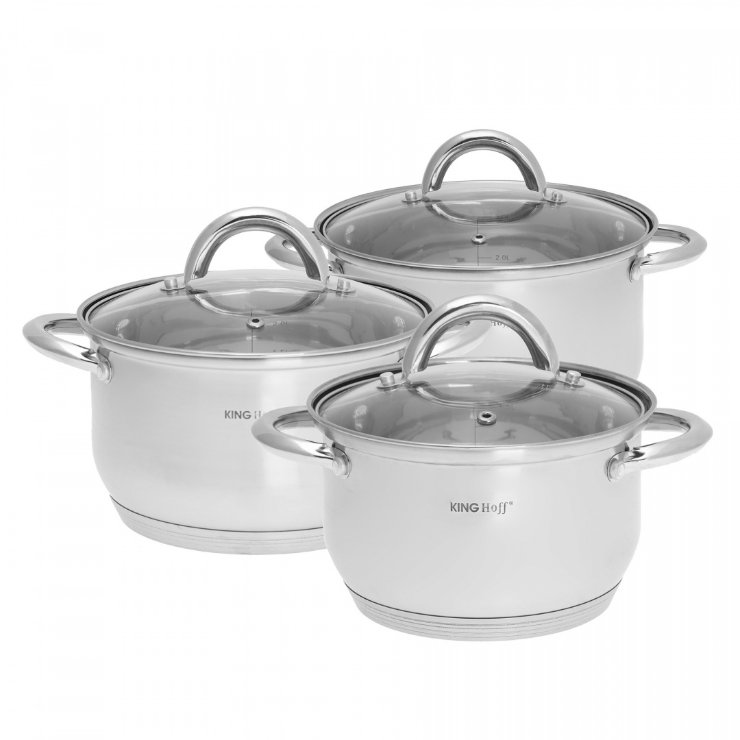 Zestaw 3 garnków ze stali nierdzewnej (6 elementów z pokrywkami). Pojemności: 2.9L, 3.9L, 6.6L. Miarka, dno indukcyjne. Marka Kinghoff.