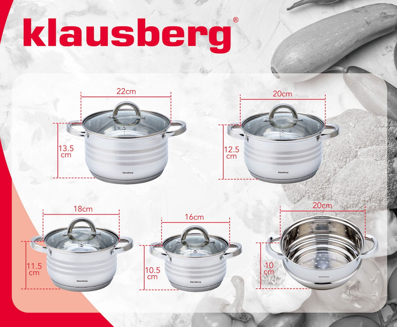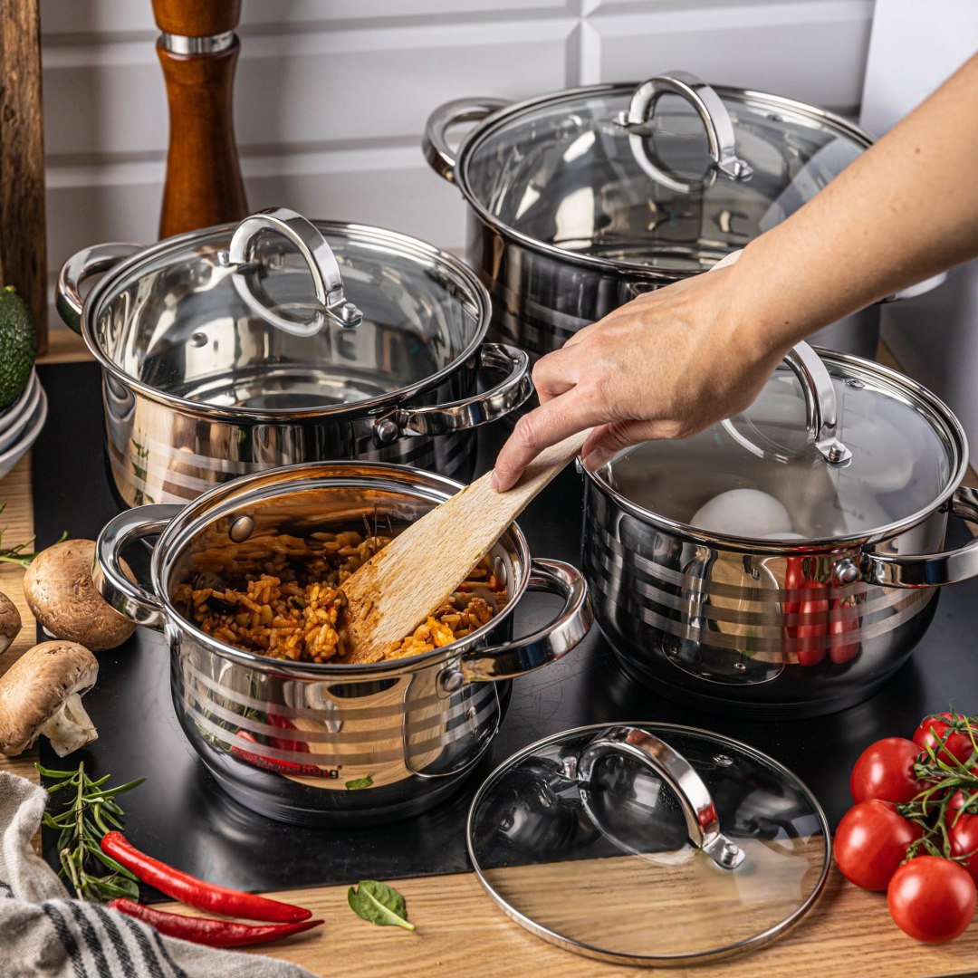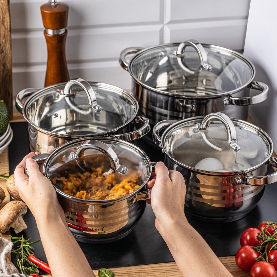 Komplet 4 garnków ze stali nierdzewnej firmy KLAUSBERG. Stal nierdzewna chromowo-niklowa z której wykonany jest cały komplet jest wytrzymała i długowieczna. Zastosowany materiał jest nie tyko najlepszy z możliwych, ale także świetnie się prezentuje i jest wyjątkowo łatwy w czyszczeniu oraz posiada właściwości bakteriobójcze. Naczynia w tym komplecie posiadają ferromagnetyczne 5-warstwowe dno akutermiczne z warstwą aluminiową gwarantuje doskonały rozdział i magazynowanie ciepła. Wszystkie garnki można używać na wszystkich rodzajach kuchenek, również na kuchni indukcyjnej. Nitowane uchwyty (polerowane). Na wewnętrznej stronie każdego garnka znajduje się praktyczna miarka. Cechy: – Wykonane z wysokiej jakości stali nierdzewnej.