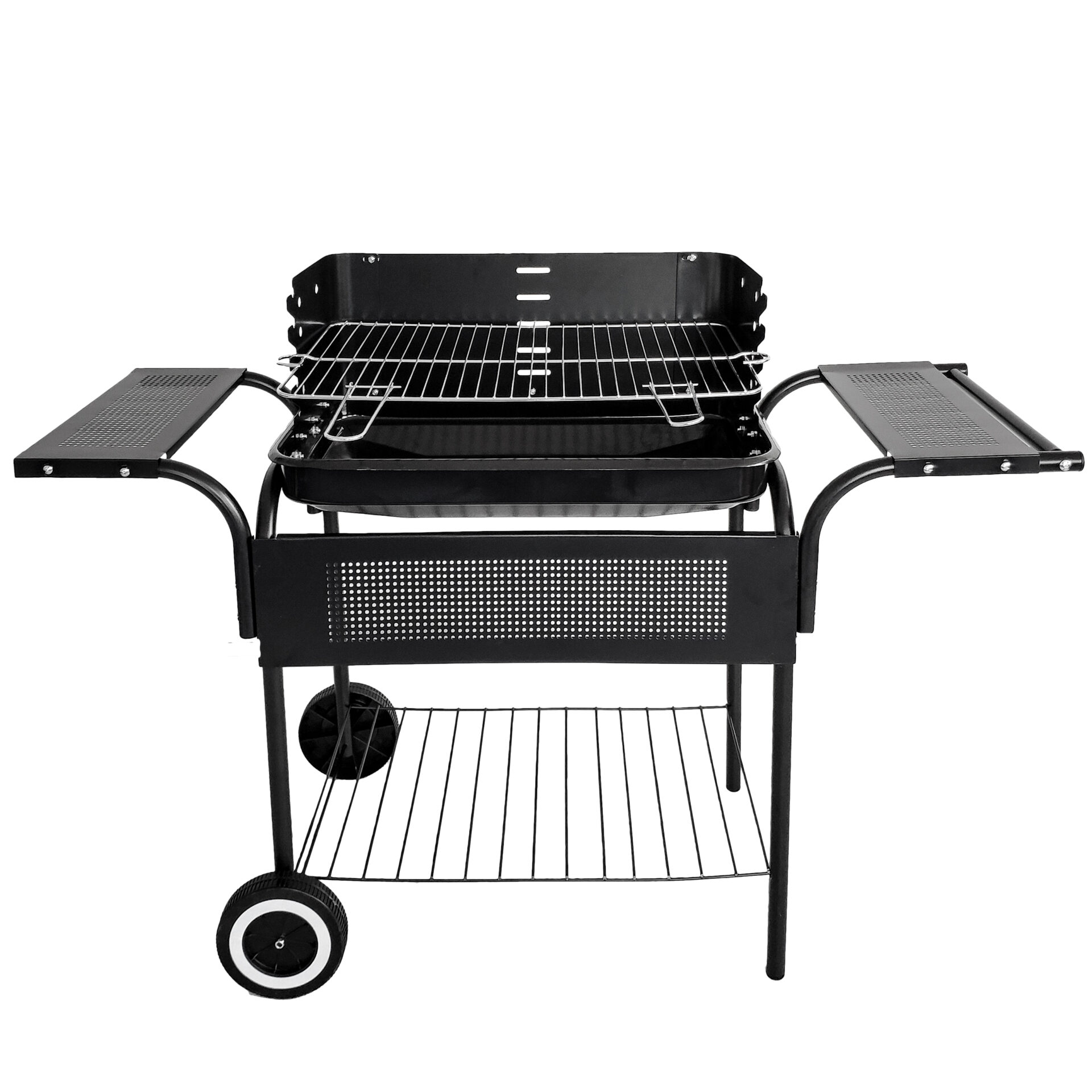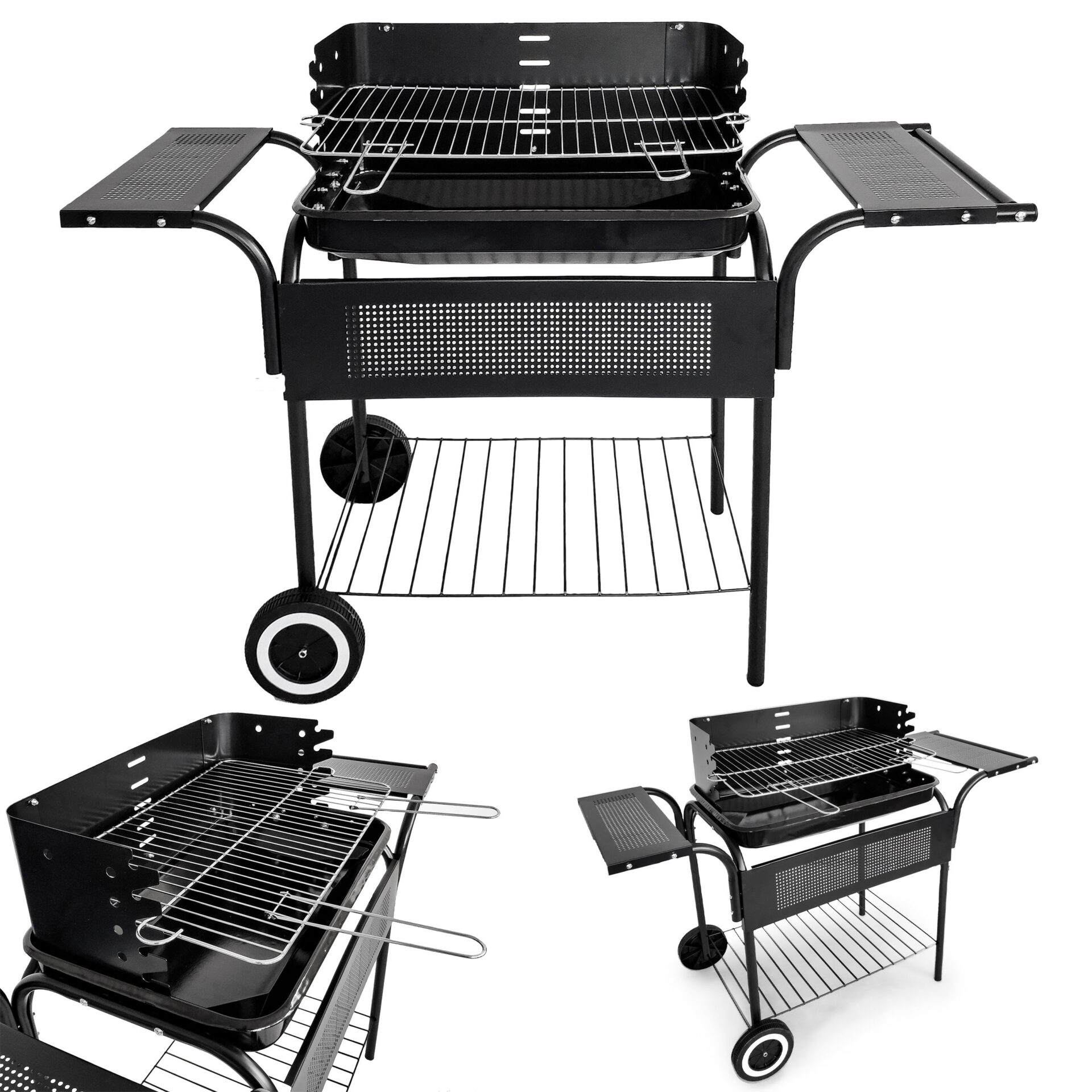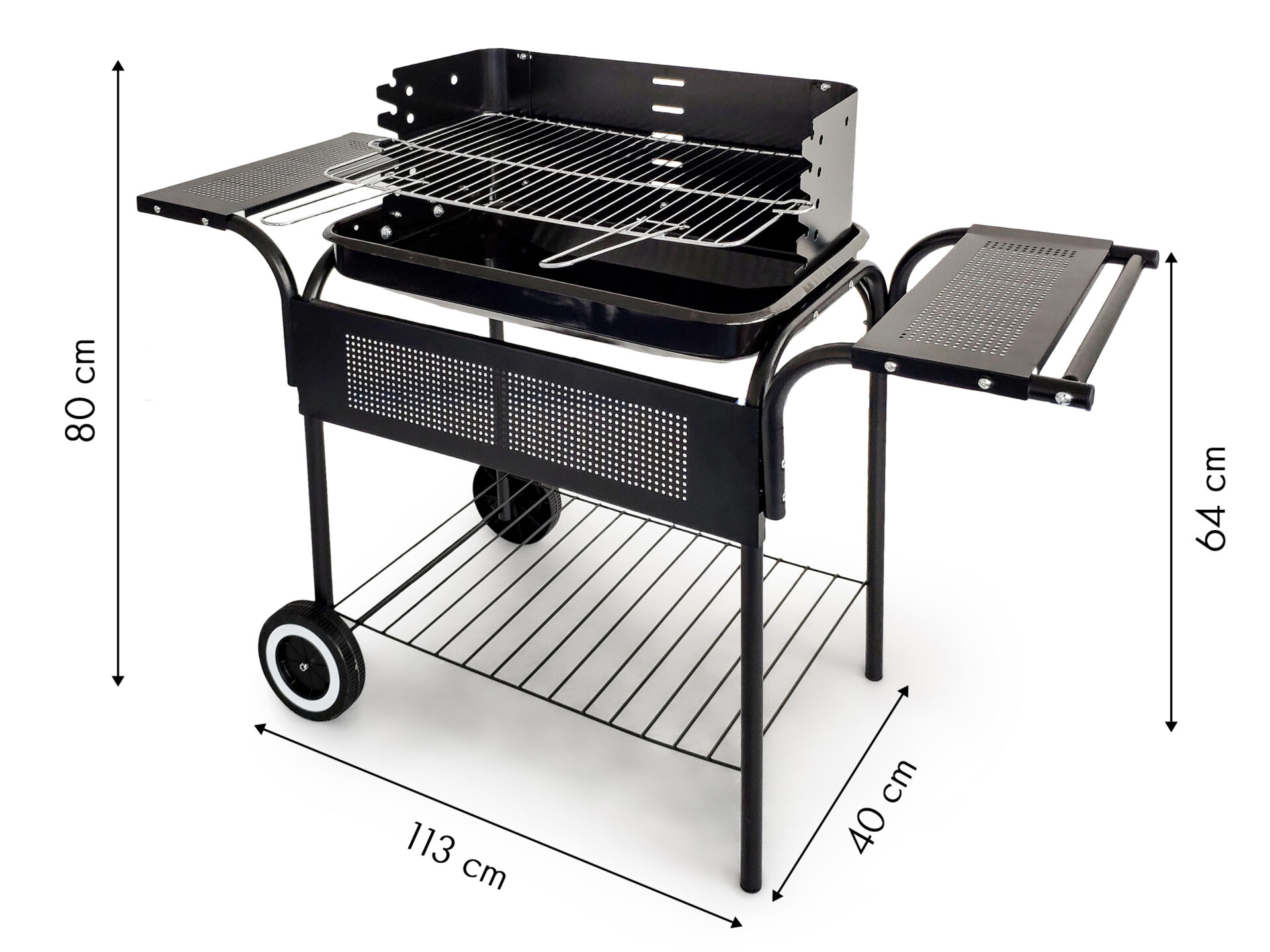 Grill ogrodowy prostokątny z rusztem 53×34 cm. Posiada 5-stopniową regulację wysokości, kółka transportowe i funkcjonalne półki. Solidna metalowa konstrukcja na lata.