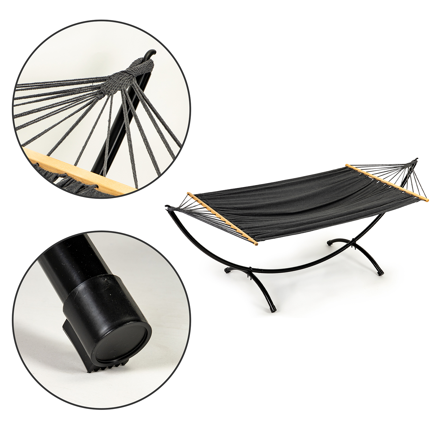 Stabilny hamak ogrodowy ze stalowym stelażem. Powierzchnia 190×110 cm, wytrzymałość do 150 kg. Posiada drewniane drążki usztywniające i antypoślizgowe stopki. Odporny na warunki atmosferyczne.